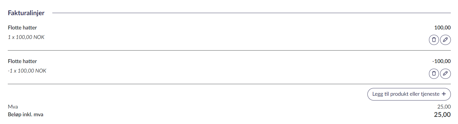4. Deretter legger du inn de nøyaktig samme produktene/tjenestene på nytt på den samme fakturaen, men du legger inn et negativt antall og velger 0% i MVA