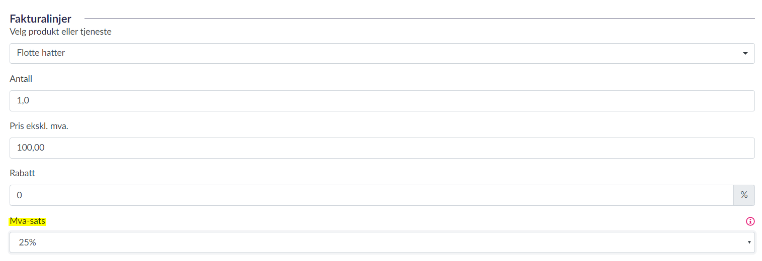 5. Lag en helt ny faktura med samme produkter/tjenester - men denne gangen så skal du velge riktig mva-sats på produktene/tjenestene