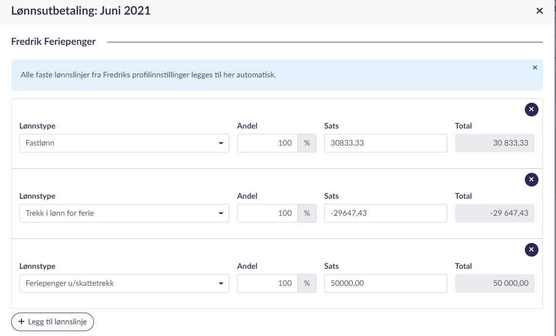 Hvis den ansatte har fastlønn, skal du beholde faste lønnslinjene. I tillegg, skal det legges til lønnslinjen “Trekk i lønn for ferie” og “Feriepenger u/skattetrekk”.