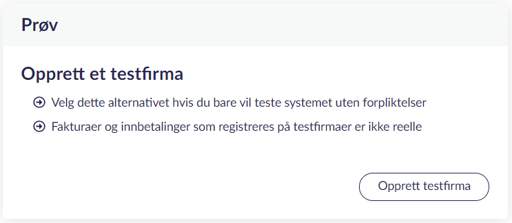 Alle brukere kan opprettet et testselskap på brukerkontoen sin. Her kan du teste ut de fleste funksjoner uten at det faktisk føres i regnskapet ditt :)