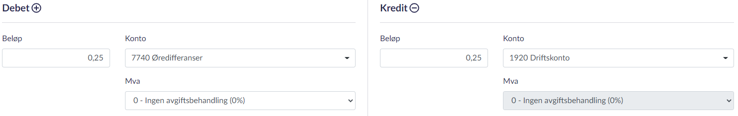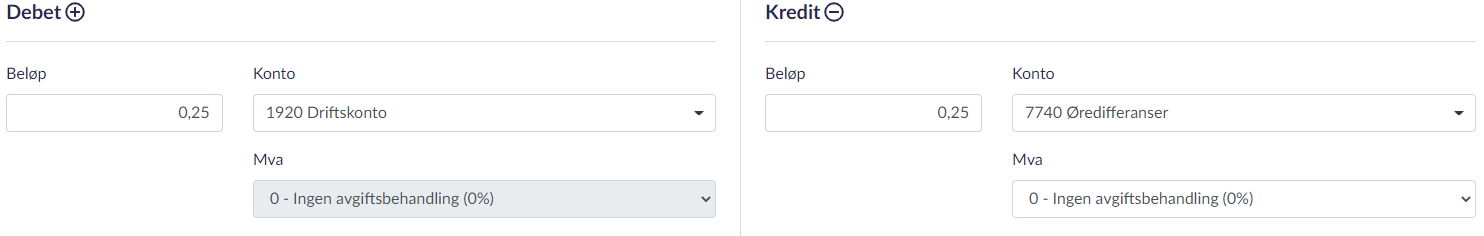 Du har sendt en faktura på 371,25. Kunden din betaler 371,50 (altså 0,25 for mye) og du får en differanse på 0,25. Da skal dette føres som vist i skjermbildet.
