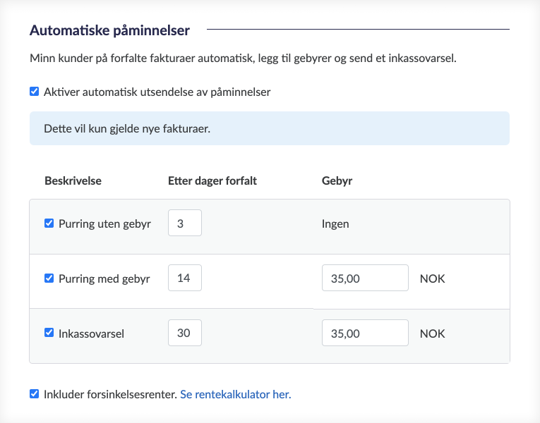 Dersom fakturaer ikke blir betalt kan vi sende ut purringer og inkassovarsel for deg. Automatiske påminnelser kan aktiveres i Innstillinger > Salg. Aktivering og endringer i innstillingene på automatiske påminnelser vil gjelde fremtidige fakturaer. Du kan selv tilpasse etter hvor mange dager purringer sendes ut og om du vil ha med renter og purregebyrer.
