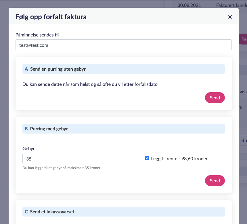 Du kan maksimalt sende to purregebyrer. Dette gjøres enten ved å sende to purringer med gebyr eller en purring med gebyr og ett inkassovarsel.