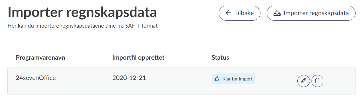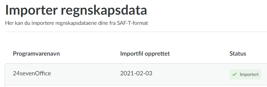 Det er anbefalt at du importerer for et helt regnskapsår om gangen, fremfor en og en måned av gangen. Skal du importere hele 2021, burde SAF-T filen du importerer gjelde for hele året og ikke enkelte måneder.