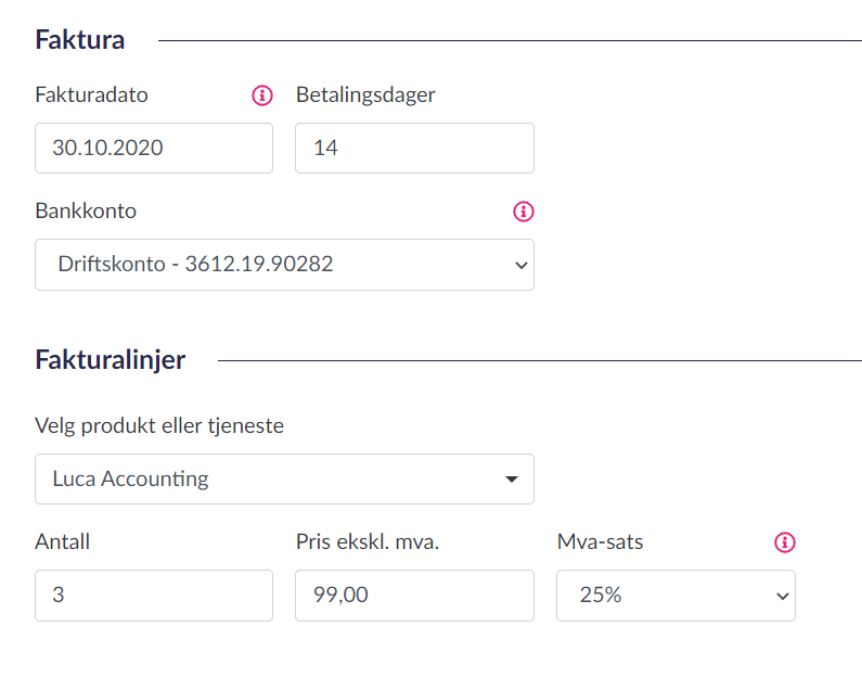 Etter at du har valgt hvem du skal sende fakturaen til, fyller du alle fakturadetaljene.