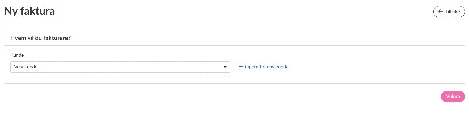 - Når kunden er valgt, klikk på “Videre” for å gå til selve utfyllingen av fakturaen