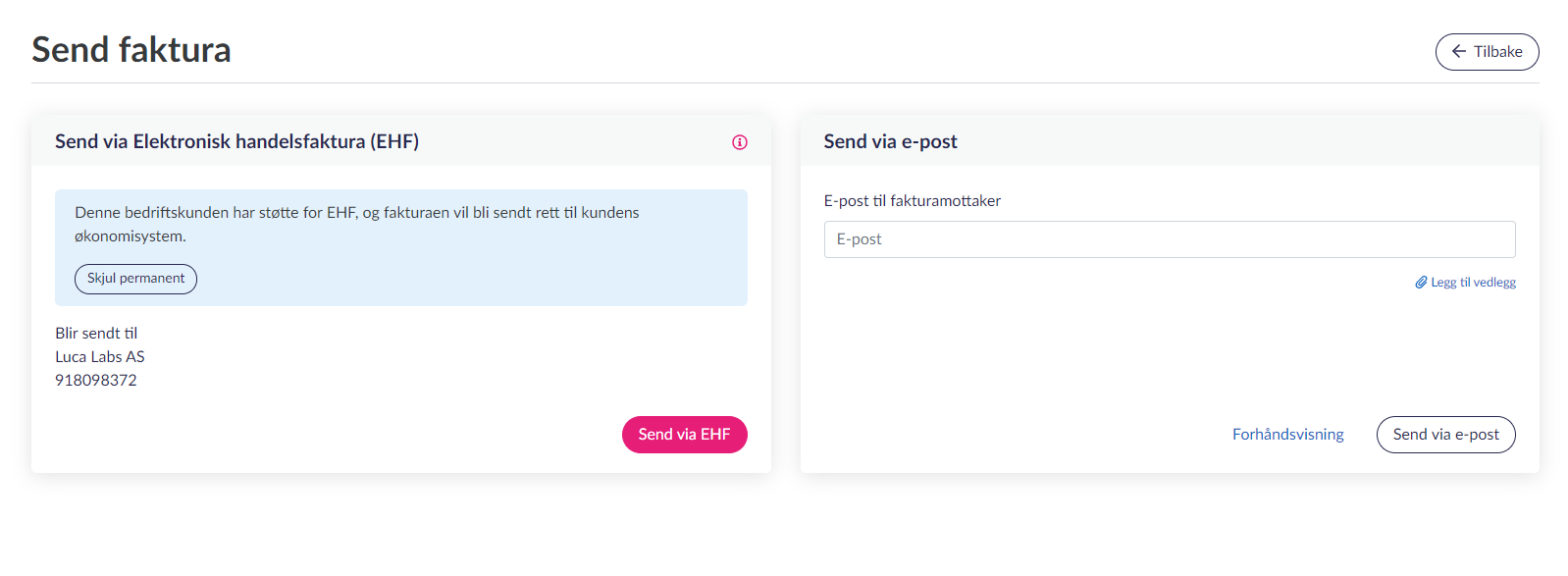 Det er noen ting som må være på plass for at du skal kunne sende fakturaen som EHF-faktura. Dersom alle disse er i orden vil vi vise deg “EHF-faktura” som et faktureringsvalg i det du sender ut fakturaen.