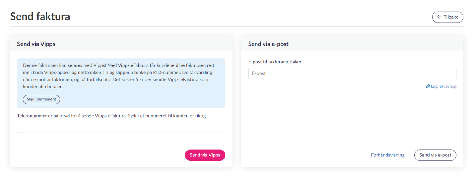 Vi støtter at du kan sende fakturaer over Vipps eFaktura og EHF. I tillegg kan du alltid sende fakturaen over e-post.